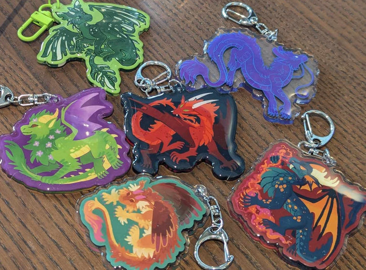 Some of my fanart merch includes pokemon, wings of fire and warrior cats. I offer a range of merch items, from prints to shirts, charms to homemade stickers, as well as homemade patches!
