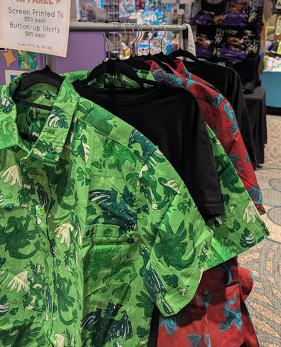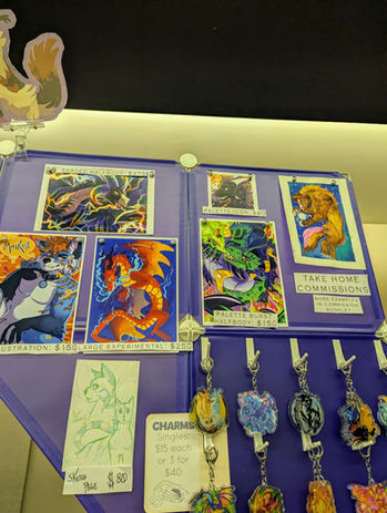 I intend to sell stickers, prints, keychains, button up-shirts, screenprinted shirts, patches, table commissions & takehome commissions, and original painted jackets at my table.